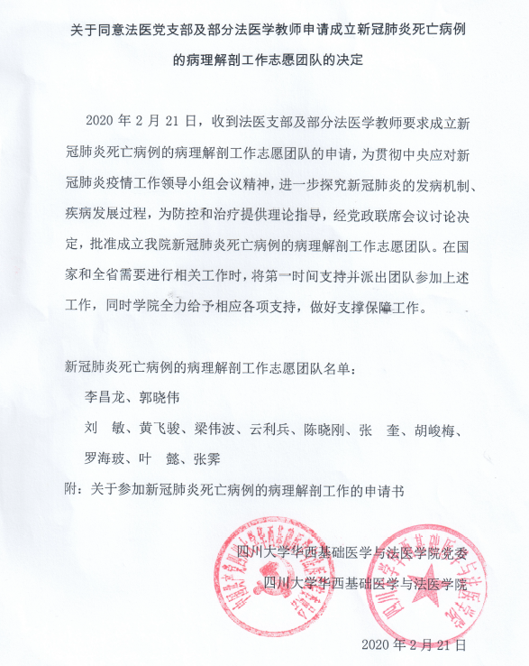 公司成立“新冠肺炎死亡病例的病理解剖工作志愿团队”