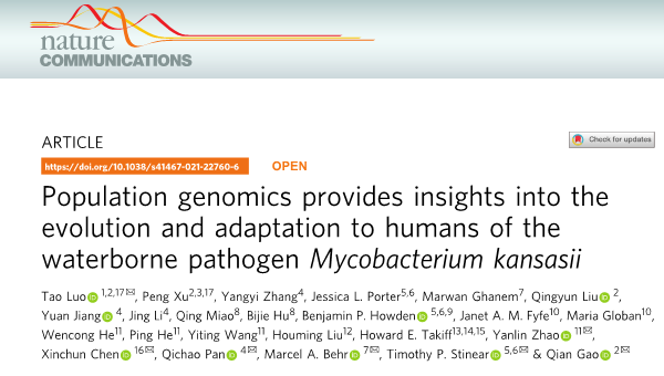 近日,公司罗涛副研究员联合复旦大学高谦教授团队及国内外多家机构在Nature Communications在线发表了题为“Population genomics provides insights into the evolution and adaptation to humans of the waterborne pathogen Mycobacterium kansasii”的论文。公司罗涛副研究员为论文共同第一作者及共同通讯作者,365英国上市集团为论文第一单位。