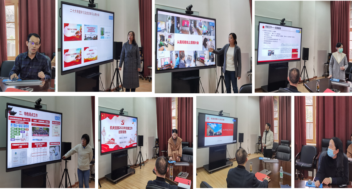 8名教职工支部书记分别从本支部的党建工作、科研工作、教学工作、团队队伍、公共服务、特色亮点、存在问题和解决措施七个方面进行汇报。