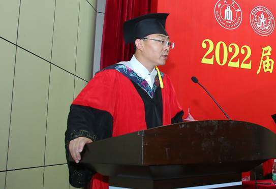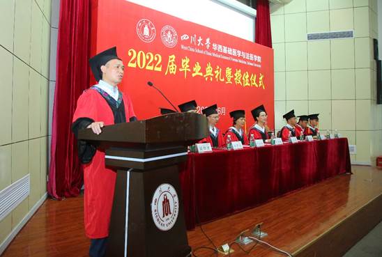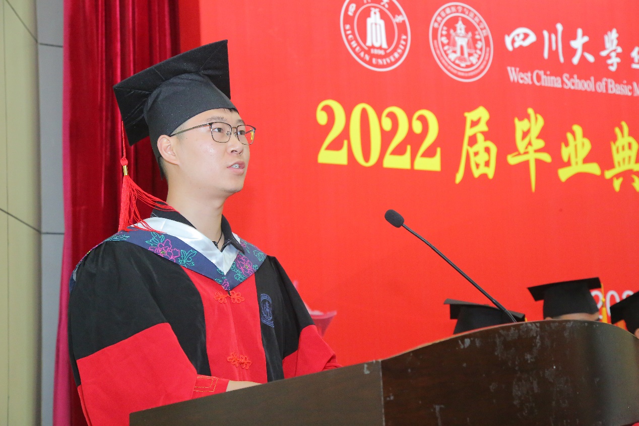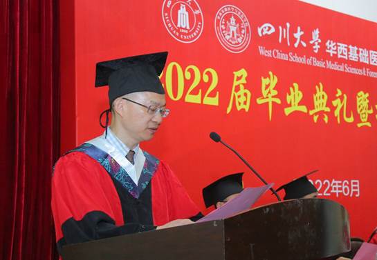 毕业典礼在庄严的国歌声中拉开序幕。经理李昌龙教授首先致辞,代表公司向2022届毕业生表示了衷心祝贺。他回顾了同学们在校期间通过不断努力所取得的成绩,为公司发展所做出的贡献。他嘱咐同学们在迈入新征程的时候,要传承川大红色基因,弘扬华西奉献精神,不忘老一辈医学专家为推动医学事业所贡献的力量;要增强自信,树立主人翁精神,积极主动作为,勇于承担解决国家发展重大需求和卡脖子难题的重任;要注重继续学习、善于学习,不断继续深造还是就业工作,都能不断提升自己竞争力,行稳致远;要坦率做人,踏实做事,把小事做好,精益求精,做一个值得信赖的人。最后,李经理祝愿同学们大展宏图,前程似锦,作为同学们永远的港湾,公司欢迎大家常回家看看。