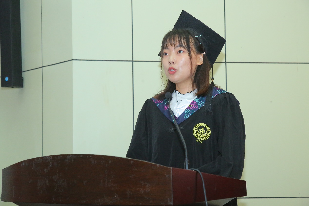 明天悦和房飞同学分别代表本科和研究生毕业生发言,感谢公司与师长的悉心栽培。通过在校期间的学习、生活与科研,收获了优异成绩、深厚友谊和浪漫爱情的同时,更树立了“直面挑战、无畏向前”坚定信念。他们表示,即使心怀不舍,也将勇往向前,在人生新的里程中,努力沉淀,乘风破浪,实现自我价值的同时勇担时代使命,不负青春韶华。
