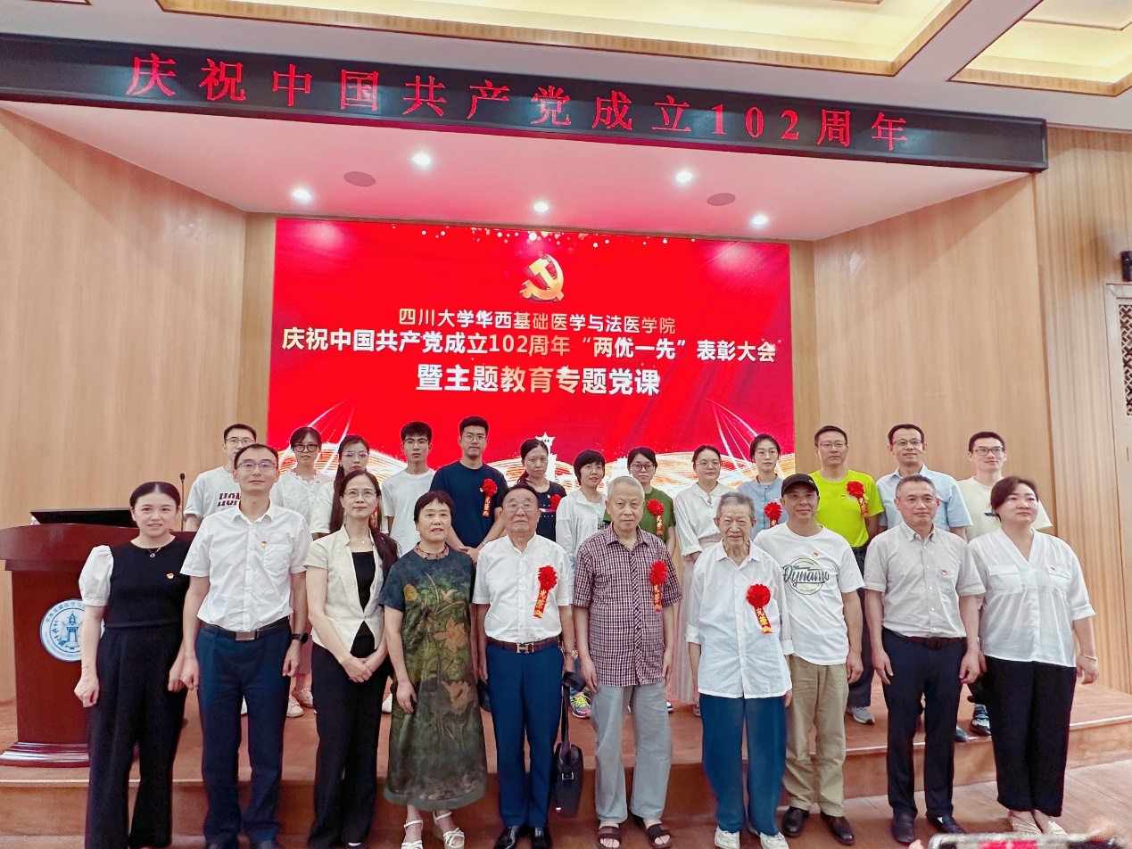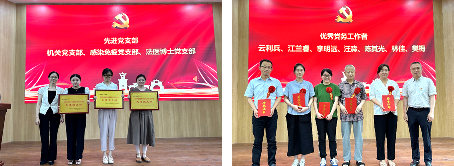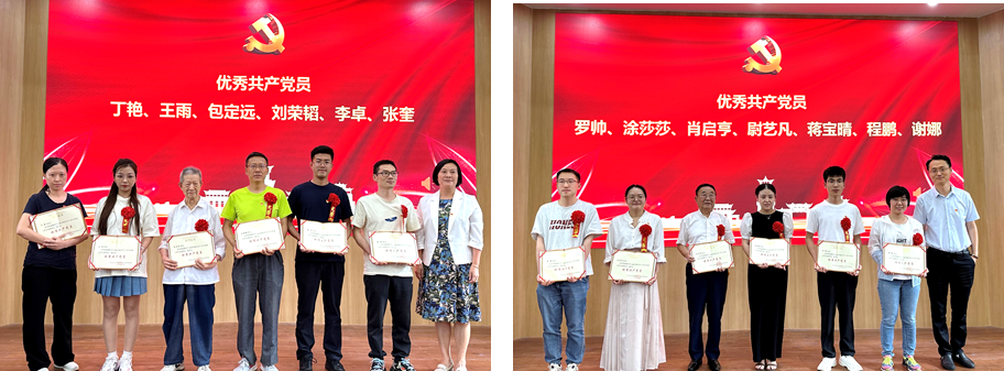 弘扬建党精神,争当先锋模范。表彰环节,由副经理罗海玻宣读公司表彰决定,公司党委委员及专职组织员向受到表彰的机关党支部、感染免疫党支部、法医博士党支部三个先进党支部,向云利兵、江兰睿、李明远、汪淼、陈其光、林佳、樊梅7位优秀党务工作者,向丁艳、王雨、包定远、刘荣韬、李卓、张奎、罗帅、涂莎莎、肖启亨、尉艺凡、蒋宝晴、程鹏、谢娜13位优秀共产党员颁发荣誉证书。大会邀请优秀共产党员代表离退休教师肖启亨老师、2022级基础医学博士生涂莎莎同学结合自身的学习工作经历发表获奖感言,优秀党务工作者代表云利兵老师分享了在主题教育期间,法医党支部在“以学铸魂,以学增智,以学正风,以学促干”方面取得的实实在在的成效。