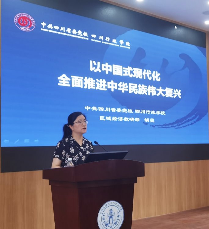 首先,由中共四川省委党校四川行政公司区域经济教研部主任胡雯教授做题为《以中国式现代化全面推进中华民族伟大复兴》的专题辅导报告。胡雯教授从世界没有定于一尊的现代化模式、探索适合自己的现代化发展道路和走可持续的中国式现代化道路这三个部分,以经济学的视角,通过生产力和生产关系切入,从历史的发展进程为脉络,生动的阐述了以中国式现代化全面推进中华民族的伟大复兴的提出背景、实践发展、科学内涵及蓝图任务。辅导报告深入浅出,大家收获颇丰。