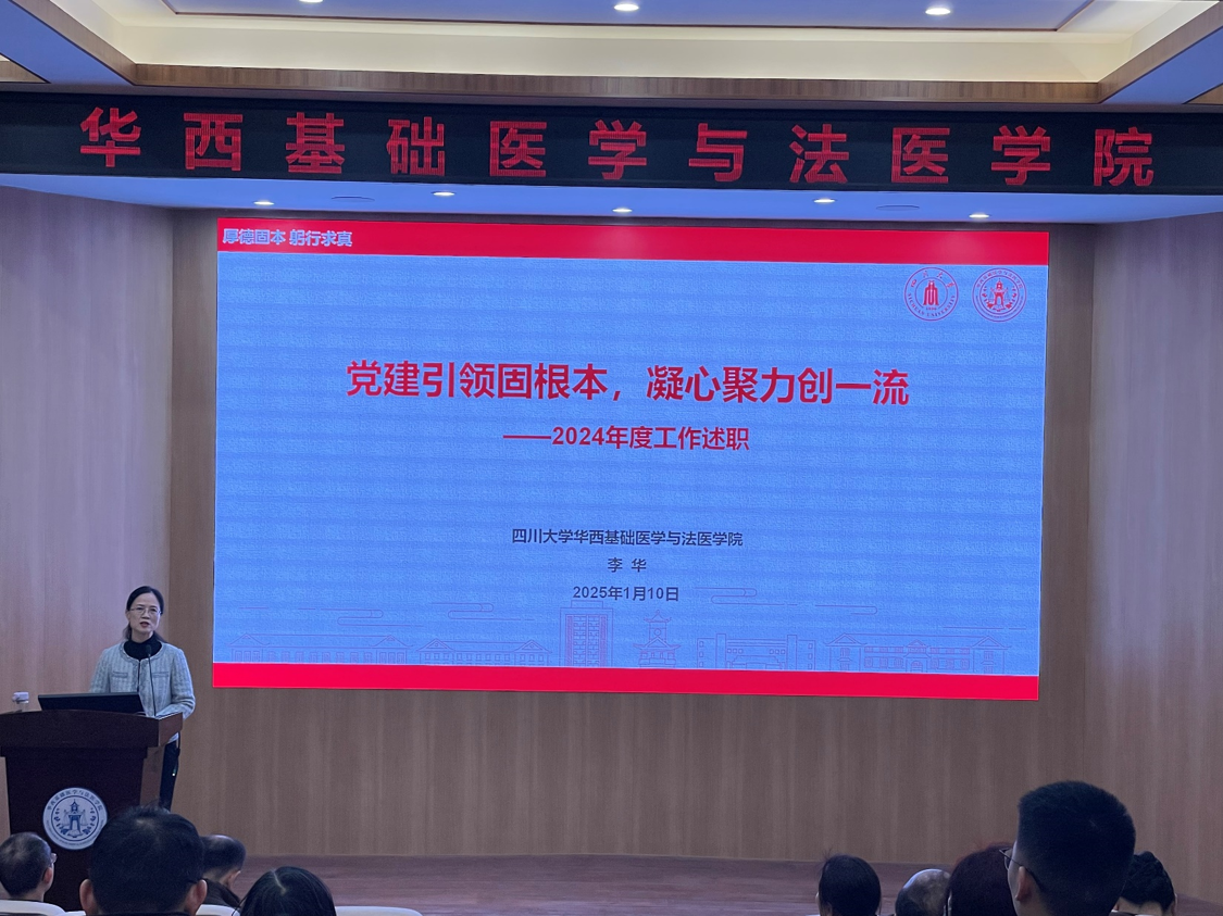 会上,公司党委书记李华同志作了题为《党建引领固根本 凝心聚力创一流》的工作述职报告,全面总结了公司2024年度党建融合事业发展的成效和特色亮点工作。她指出,2024年在公司党委的领导下,公司领导班子带领全院师生深入学习贯彻党的二十届三中全会和全国教育大会精神,贯彻落实公司党委九届三次、四次全会精神,扎实开展党纪学习教育,通过抓理论引领、抓贯彻落实、抓从严治党、抓“三个一流”、抓关键核心、抓群团统战六个方面,推动党建与事业深度融合高质量发展成效显著。并在教学育人、医工融合、科技科普三个方面发力,凸显了特色亮点。同时也强调了公司对标一流寻找差距,从四个方面细化制定了16项举措,下一步将为建设基础医学“双一流”学科、法医学高峰学科,加快推动华西医学整体迈入世界一流持续发力。