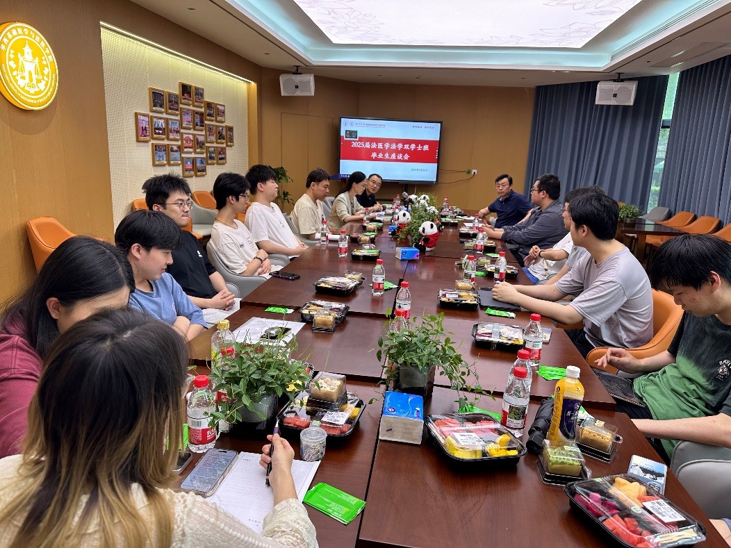 2025年5月26日下午在逸夫楼职工之家公司召开了第一届法医学法学双学士专业毕业班座谈会,公司党委书记李华教授、党委副书记、副经理罗海玻教授、副经理梁伟波教授、辅导员彭铎出席会议,会议由罗海玻主持。