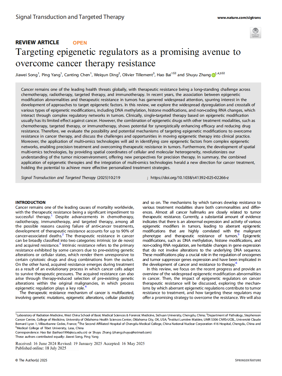 近日,公司张舒羽教授团队在《Signal Transduction and Targeted Therapy》杂志发表题 “Targeting epigenetic regulators as a promising avenue to overcome cancer therapy resistance”的综述论文,系统总结了表观遗传调控在癌症治疗耐药中的关键作用,并提出了以表观遗传干预为核心的肿瘤组合治疗新策略。