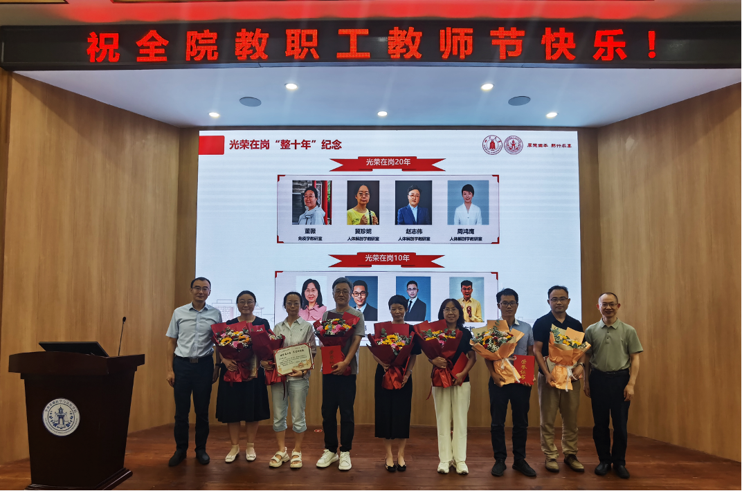 为弘扬先进典型,彰显榜样力量,公司党委书记李华宣布了2025年春季学期以来获得各级表彰的教师和光荣在岗“整十年”教职工名单,对各位获奖教师表示祝贺,希望全院教职工向榜样学习,奋发有为。向各位光荣在岗“整十年”的教职工表示感谢,感谢他们一路以来为公司发展作出的贡献,并为他们颁发纪念证书和鲜花。
