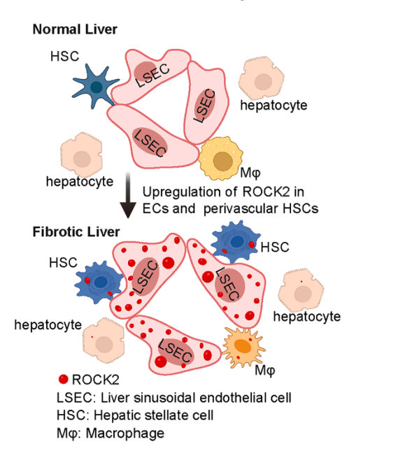 在肝纤维化的研究中,研究团队发现Rho关联卷曲螺旋蛋白激酶-2(ROCK2)在肝内皮细胞和血管周围肝星状细胞特异性上调,而ROCK1的表达无显著变化。机制上,ROCK2的异常激活驱动肝窦内皮窗孔消失和基底膜沉积,即“毛细血管化”(capillarization),其特有的窗孔(fenestration)结构消失,破坏了肝脏血管的物质交换和稳态。同时,ROCK2上调血管旁分泌因子Galectin-3,后者不仅促进炎症与纤维化因子释放,更直接激活肝星状细胞,形成促纤维化循环。逆转肝纤维化的关键在于恢复肝窦血管的Angiocrine功能及生理性“窗孔”表型。因此,靶向血管源ROCK2可同时干预纤维化的结构和功能核心环节。