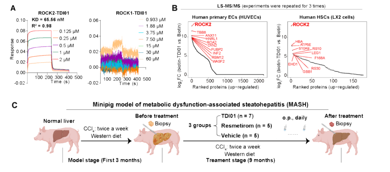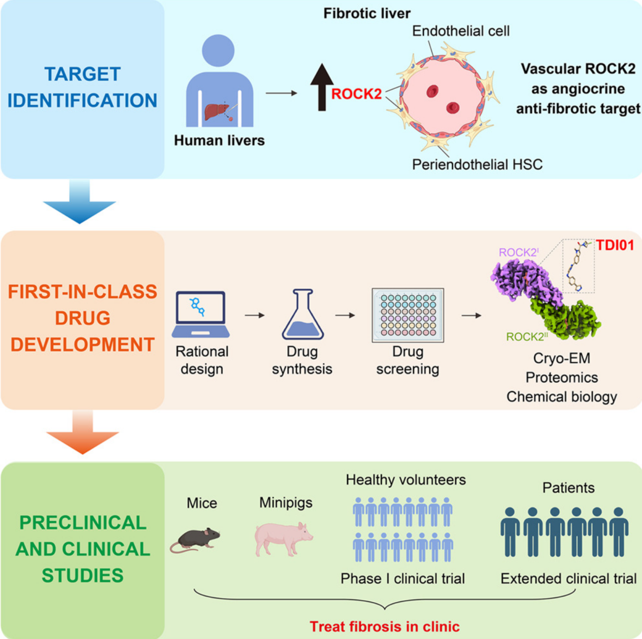 为实现这一治疗目标,寻找可干预的分子靶点成为研究的关键。3月6日,公司丁楅森团队联合华西第二医院曹中炜研究员,中国医学科公司北京协和医公司王辰院士和北京泰德制药公司等在Cell发表题为《Selective targeting of endothelial and perivascular angiocrine ROCK2 treats liver fibrosis》的研究论文。本研究构建了肝纤维化first-in-class新药研发的完整闭环:从发现血管微环境核心靶点ROCK2,到阐明其通过“血管旁分泌”信号驱动疾病的机制,进而以此为基础研发首创新药TDI01,并最终完成临床验证,为靶向血管的抗纤维化新药研发提供了从理论到临床的坚实基础。