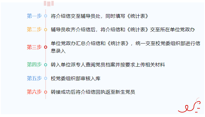 2.新入职教职工党员入职报到后,应主动到公司党委组织部联系办理组织关系转入手续。通过线上转入的,及时到单位党政办核实转入情况,其他步骤同新生党员;通过线下转入的,介绍信由个人交至公司党委组织部办理,其他步骤同新生党员。