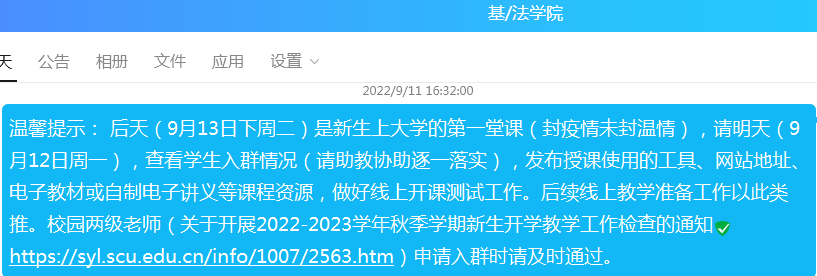 2022年秋新生开学际,泸定发生6.8级地震,疫情再次侵袭,2022级新生有的还未来到他们梦寐以求的大学,就要开启大学的学习生涯。上课第一周恰遇中秋节、教师节,在这非常时期公司和公司高度重视“疫情”下新生第一周线上教学工作,专门发文(关于开展2022-2023学年秋季学期新生开学教学工作检查的通知),公司按照教育部、公司对疫情下开展教学工作的部署与要求,全面开启线上教学。