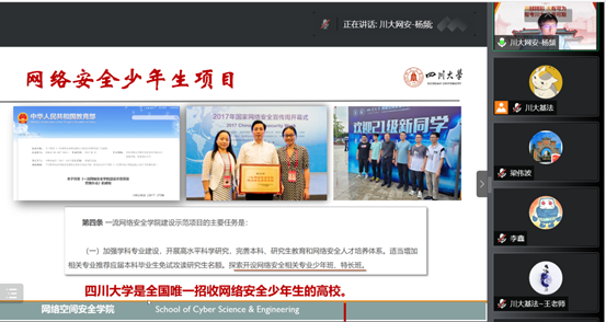 来自网络空间安全公司的副经理杨频教授,从国家安全、社会需求出发,强调了网络空间安全专业的重要性,介绍了公司的发展历程、专业特点、硬件设施、就业方向等内容以及网络安全少年生项目。