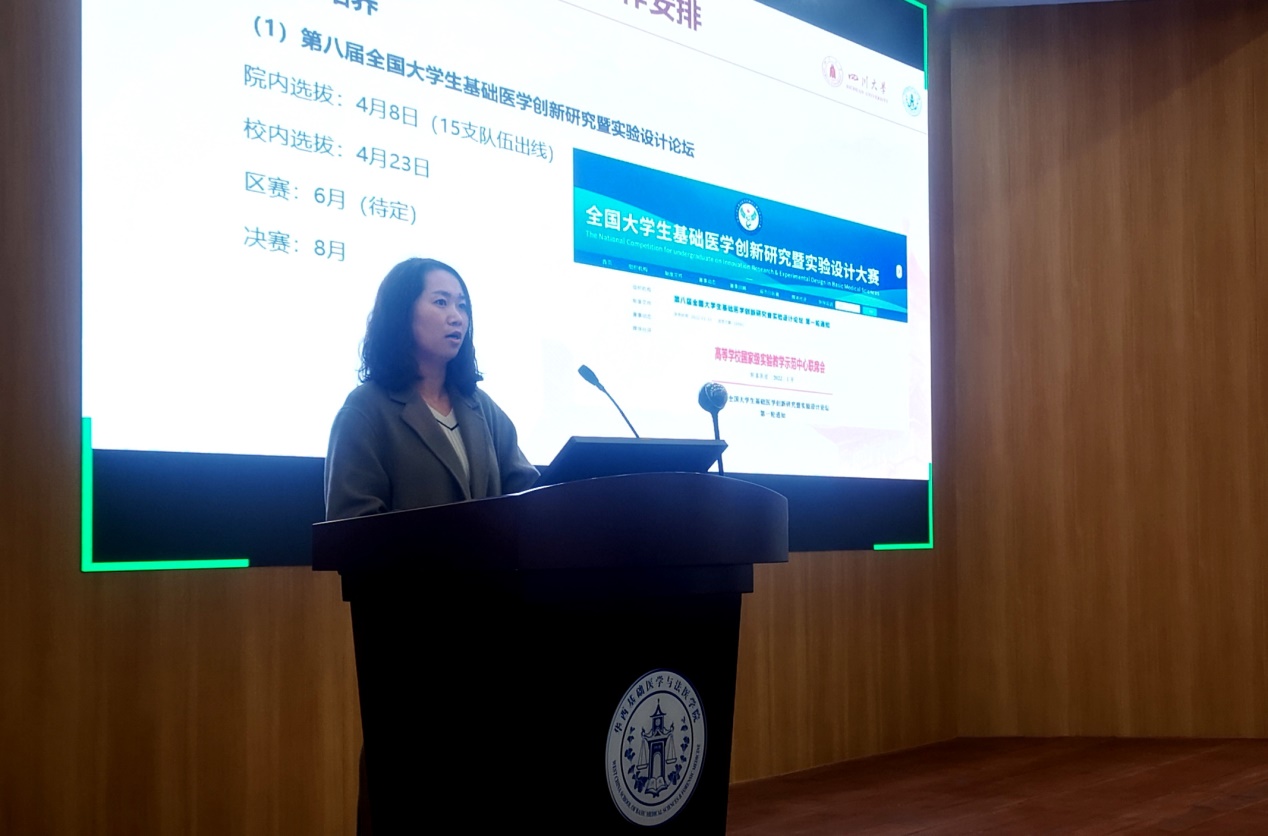 教学科科长董晓爱为大家汇报了本科教学近期在教改、教学竞赛等方面取得的进展,对第八届全国老员工基础医学创新研究暨实验设计论坛、大创、毕设、职工等工作进行了重点讲解。她认为,《人民日报》在《培创新土壤促冒尖成长(③)》中,报道了公司基础医学拔尖人才培养相关改革举措,这是对公司在基础医学拔尖人才培养方面取得成效的极大肯定,也对我们提出了更高的希冀。希望全院师生能继续在基础医学拔尖创新人才培养方案修订、导师制落实、国际化培养等方面进行大讨论,为积极构建具有川大风格、华西特色的基础医学人才培养体系建言献策。