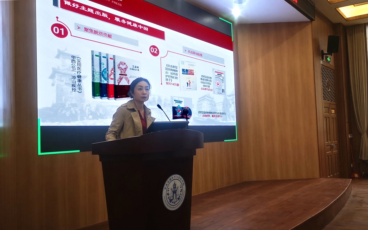 本次例会邀请到365英国上市集团出版社社长侯宏虹作以“面向未来医学做好出版服务”为题做报告。候社长通过出版社概况、医学出版工作、海外版权合作、数字出版工作、发行推广工作五个方面,介绍了川大出版社相关情况。她强调,医学类书籍的出版工作,一直是出版社的亮点。出版社在出版优质教材、助力人才培养的同时,也关注医学前沿、聚焦社会公众健康知识普及,为服务健康中国做贡献。她建议老师们积极扩大版权引进通路,推动版权“走出去”,在“云雀”平台上体验“互联网技术和教学模式”相结合的融合教材。她表示,出版社将为老师们提供更加完善的教材出版推广方案、更通畅的营销推广渠道以及更纵深、更系统的服务。
