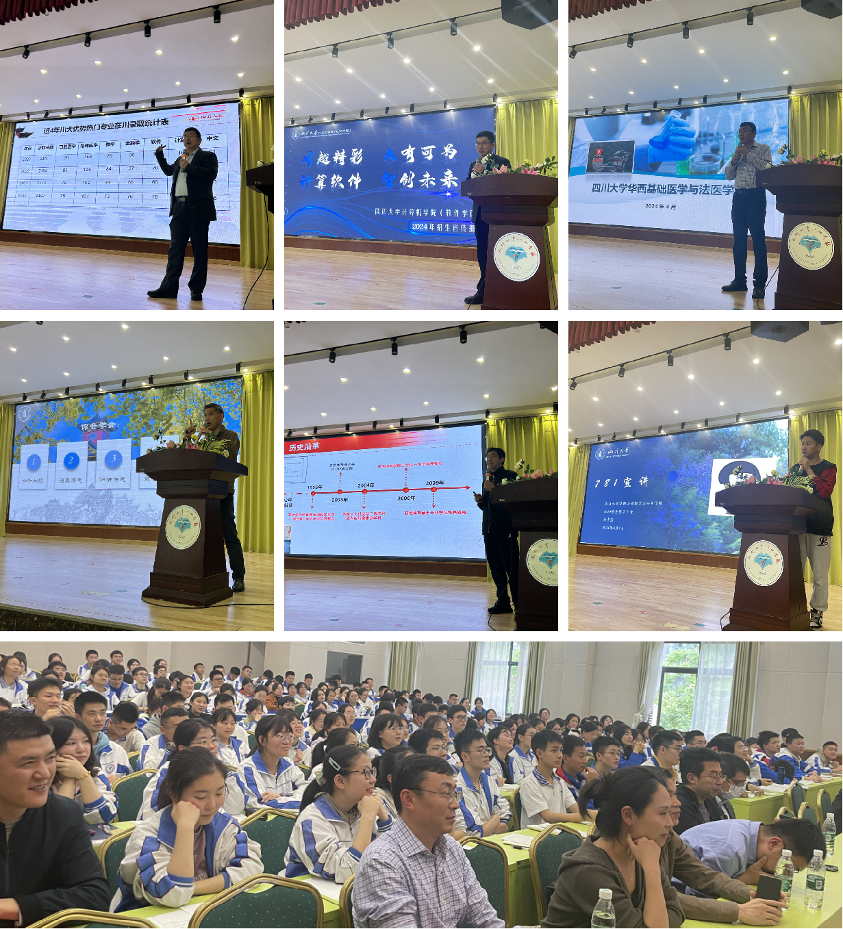 在全体参会人员奏唱国歌后,廖主任以川大悠久的历史切入,对川大人才培养模式、在川招生政策、志愿填报策略等方面进行了详细介绍,为员工报考川大提供了最新资讯。随后,体育公司、历史文化公司、计算机公司以及公司分别对各自公司的历史、专业构成、人才培养优势进行了介绍。公司梁伟波教授还为现场师生介绍了运用生成式AI模型对无名烈士进行身份鉴定和容貌复原的工作,播放了央视国防军事频道CCTV7《正午国防军事》栏目对该工作的专题报道,现场师生反响热烈。在此次宣讲活动中,公司2020级法医学专业本科生孙中杰跟随宣讲团重回高中母校,围绕在公司丰富多彩的生活、学习以及高考经验与学弟学妹们进行了分享交流。最后,成都七中八一公司副董事长沈健发表总结致辞。