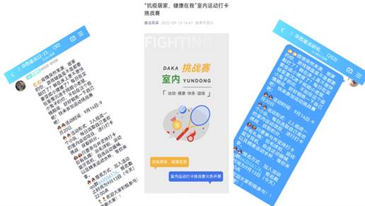 本学期开学之初成都突然面临严峻的疫情,极大影响了川大学子在校的学习生活。公司积极做好防疫宣传与引导工作,公司研究生会组织举办了本次运动打卡活动,鼓励大家积极参与运动、锻炼身体,增强免疫力、抵御病毒入侵的同时丰富抗疫生活。本次活动两人一组,同学们互相督促共同运动,充分体现了互惠互助的团队精神。