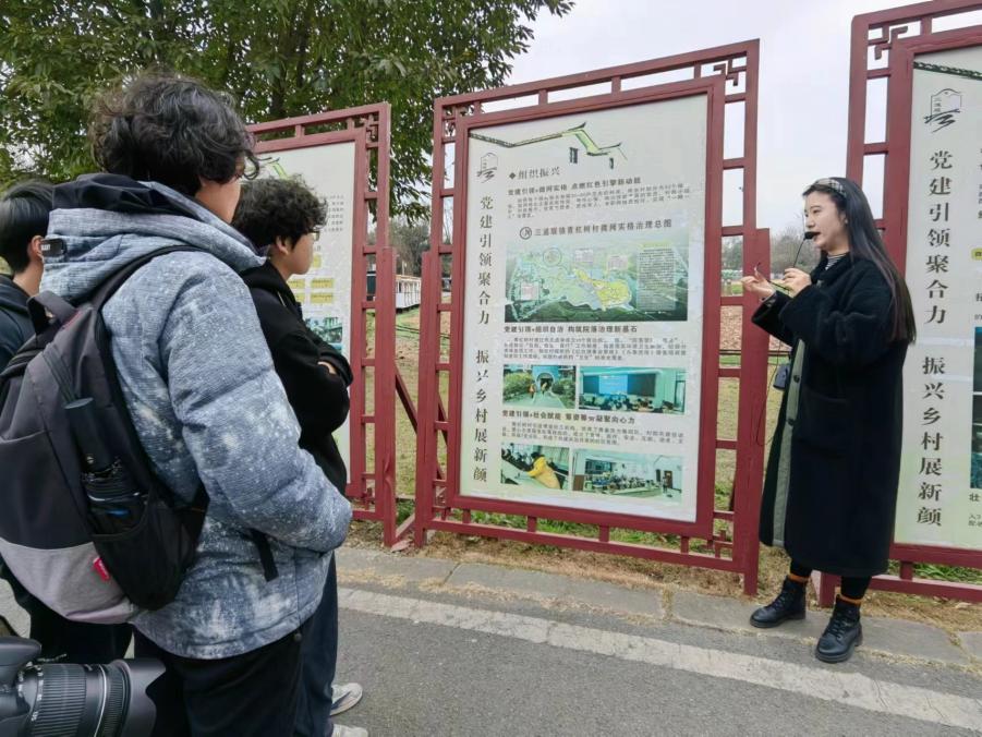在三道堰镇青杠树村,在公司优秀员工王森甲的带领下,同学们聆听社区讲解员讲述的乡村发展、民生改善的故事,通过图片介绍与实地参观,同学们见证了乡村振兴战略的实施给该村带来的变迁与发展,在参观中深入了解这个具有悠久历史的川西小镇,如何充分利用有利条件,打造休闲旅游产业,成为了四川省实施乡村振兴战略工作示范村以及“中国十大最美乡村之一”的光辉历程。
