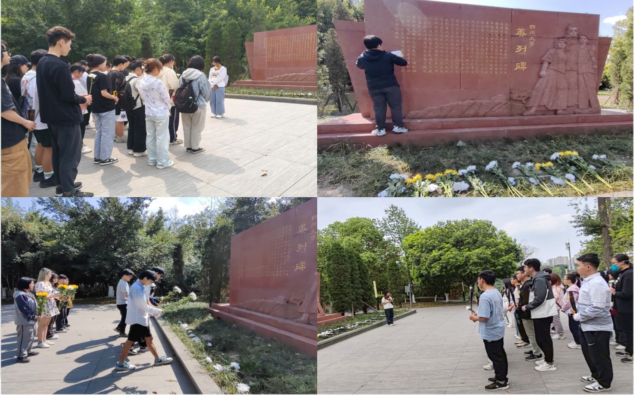 4月1日下午,同学们分别在江安校区革命英烈纪念碑广场、华西校区毛英才烈士雕像广场前举行了清明祭扫活动。同学们肃穆而立,向革命烈士默哀致敬,而后依次向英烈碑敬献鲜花、擦拭英烈碑,表达对革命先辈的崇高敬意。