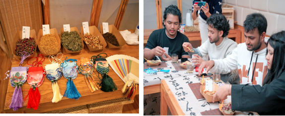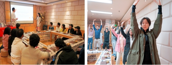 随后带领职工们前往中医馆,在专业中医老师的讲解下,职工们学习了秋冬季养生保健知识,品尝了陈皮茶,了解了八段锦每个动作的要点和养生原理,一同练习了八段锦,在体验中释放压力,感受动静结合的中医养生智慧。还带领大家了解了中医香囊的用途,并体验中医香囊的制作,书写了祝福笺,体验中医文化中的“衣冠疗法”和“吉祥文化”。同时为职工们讲解了中医常用的艾灸,介绍了艾条的用途和制作流程,带领职工们一起制作了艾条,体验到了专业的艾灸,最后为职工们准备了“柿柿如意”艾草锤,希望大家学习生活事事如意,健康快乐,活动现场氛围轻松愉悦。