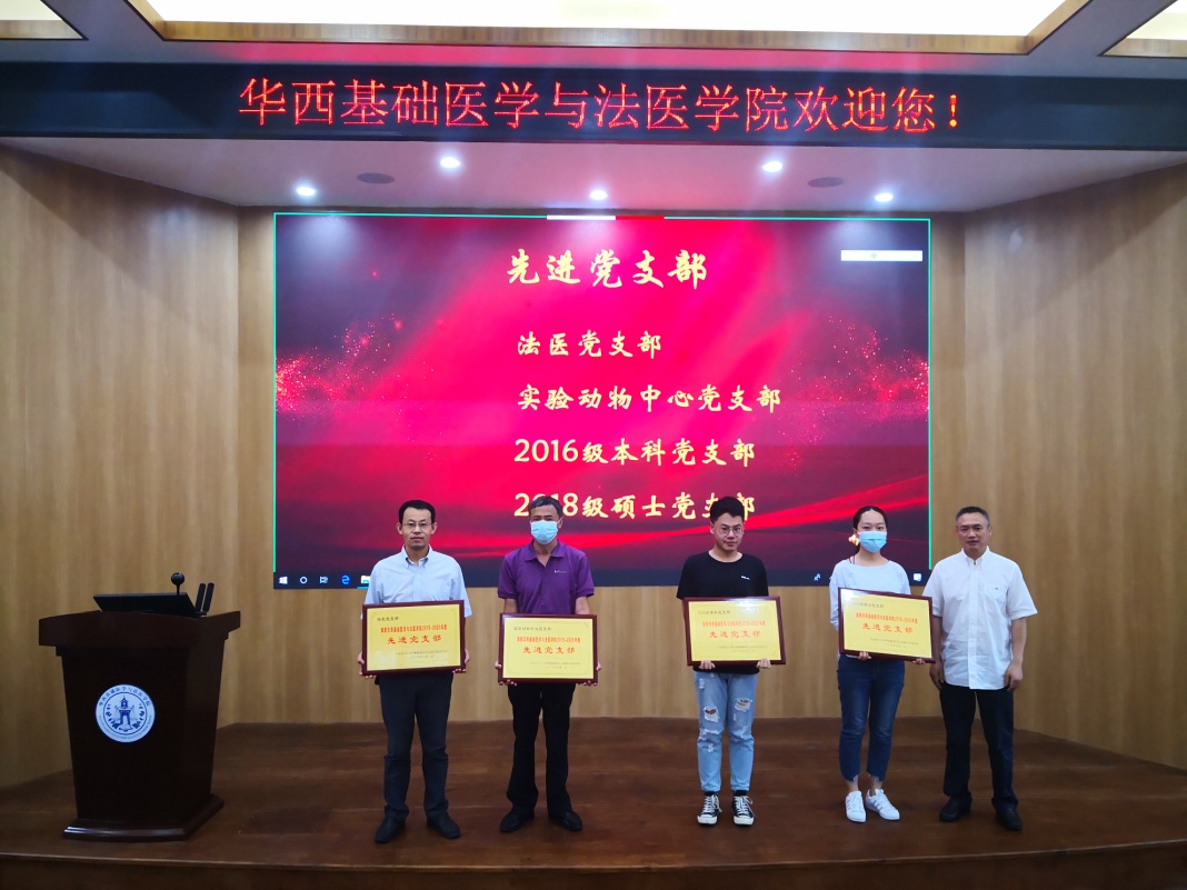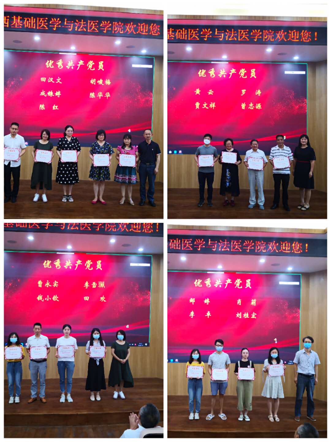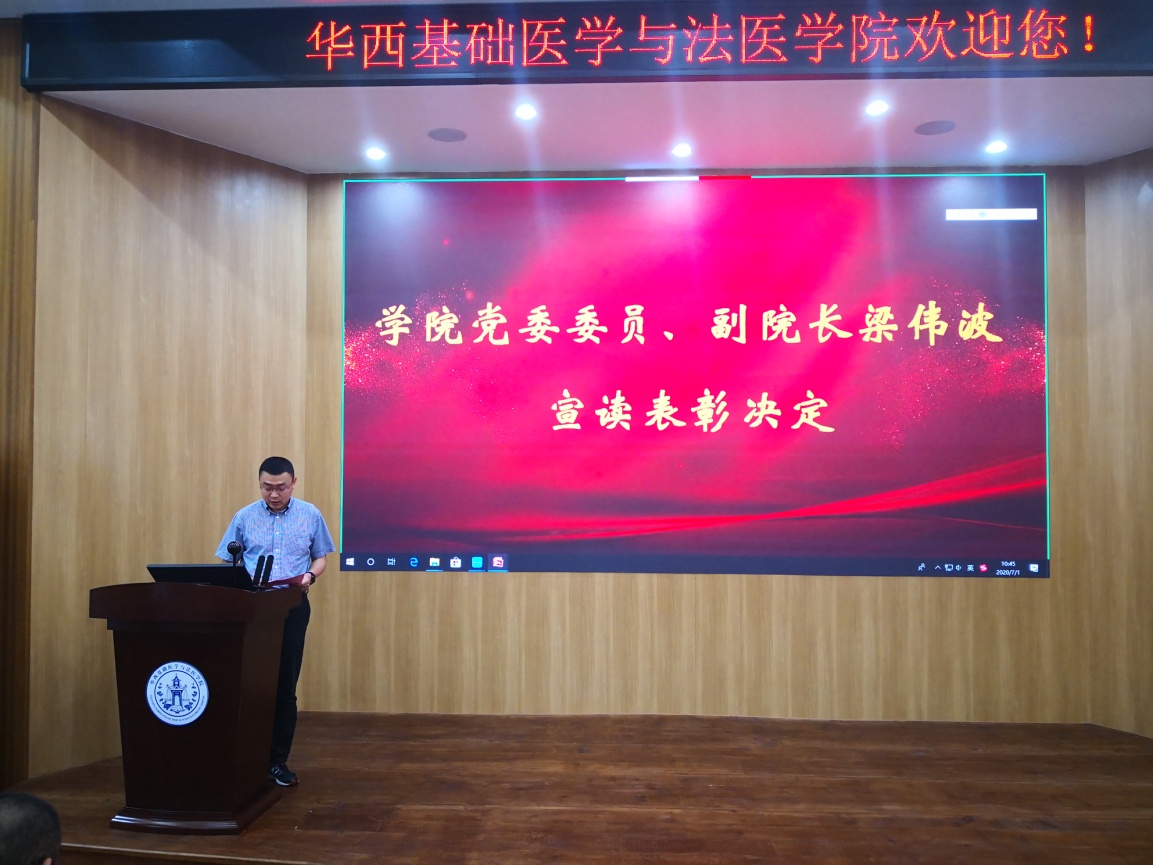 在庆祝中国共产党成立九十九周年之际,为充分发挥先进典型的示范引领作用,激励全院师生党员不忘初心、牢记使命,更加自觉地投身公司“两个伟大”建设,公司党委决定表彰一批先进支部及党员同志、党务工作者。公司党委委员、副经理梁伟波宣读了表彰决定:授予法医党支部、实验动物中心党支部、2016级本科党支部、2018级硕士党支部“先进党支部”称号;授予宋凤、刘学旭、郑风劲、高伟、林佳、黄英、李涛、尹璐8位同志“优秀党务工作者”称号;授予田汉文、胡峻梅、成姝婷、陈华华、陈红、黄云、罗涛、贾文祥、曾志源、曹永实、李雪珮、钱小钦、田欢、邹婷、肖莉、李卓、刘桂宏17位同志“优秀共产党员”称号。先进党支部代表云利兵老师、优秀党务工作者代表林佳老师、优秀共产党员代表李涛同学分别结合自身工作、学习进行了发言。