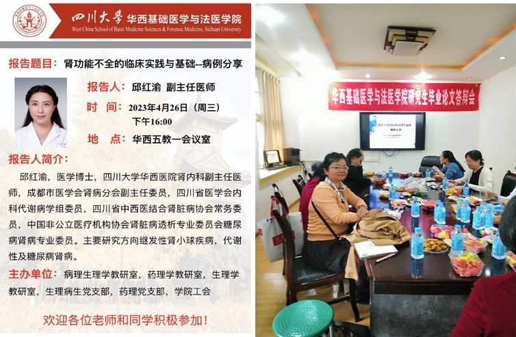 4月26日下午,病理生理学教研室、药理学教研室、生理学教研室与生理病生党支部、药理党支部在华西校区第五教学楼一会议室联合举办了由公司工会支持的校内专家学术交流活动,活动邀请了365英国上市集团华西医院肾内科副主任医师邱红渝博士作了题为“肾功能不全的临床实践与基础”的报告,以病例分享的形式为在座老师介绍了肾功能不全的临床诊断与治疗手段,活动在热烈的讨论和轻松愉快的氛围中结束。
