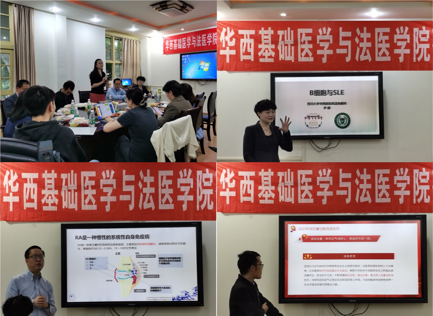 4月21日上午,药理教研室、药理支部与病理生理学教研室在华西校区第五教学楼药理会议室联合开展了由公司工会支持的党风廉洁教育暨基础临床学习交流会议,会议邀请了华西医院风湿免疫科主任谢其冰教授和华西医院全科医学中心主任/特需医疗中心主任/健康管理中心主任尹耕教授进行学术讲座,药理党支部成员、药理教研室、应激医学研究室和病理生理学教研室师生参加了会议。