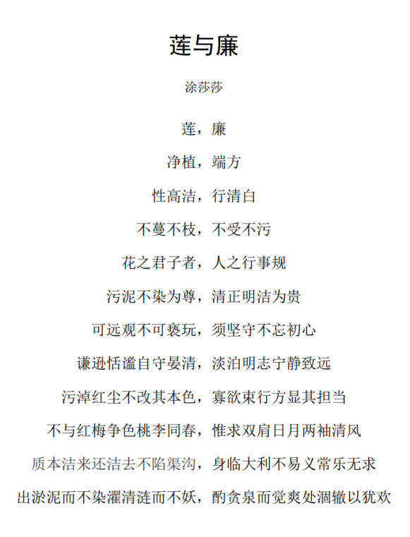基础博士党支部同学积极响应参与教育部第八届高校“廉心文语”校园征文,涂莎莎创作《莲与廉》征文作品。莲出淤泥而不染,廉处世欲而不贪,古人云:“君子为政之道,以修身为本”。党员同志应修身养性,筑牢道德防线。