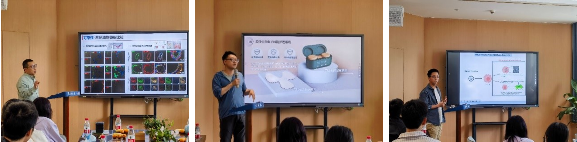 主题报告环节,由沈阳研究员围绕颅内动脉瘤的研究难点和痛点,剖析了颅内动脉瘤现有体内外模型的局限性,介绍了探索颅内动脉瘤血管重塑的全新三维微流控血管芯片构建原理和优势,并分享了该技术在颅内动脉瘤研究中的应用案例、初步成果和未来应用方向。陈镜宇特聘研究员为大家揭示了核仁应激与肿瘤治疗的重要关系,详细阐述了核仁应激的原理、调控机制以及其在肿瘤发生发展中的影响,同时介绍了目前国内外在核仁领域的研究进展和最新成果,为大家描绘了一幅关于核仁及核仁应激的精妙画卷。胡雪丰副研究员分享了生物医用柔性电子产品的研发,特别强调了柔性电子产品与传统刚性电子产品相比的优势,能够更好地适应人体的曲线和动态变化,为医疗诊断和治疗提供更加精准和舒适的解决方案,在医疗领域中具有巨大的应用潜力和市场前景。