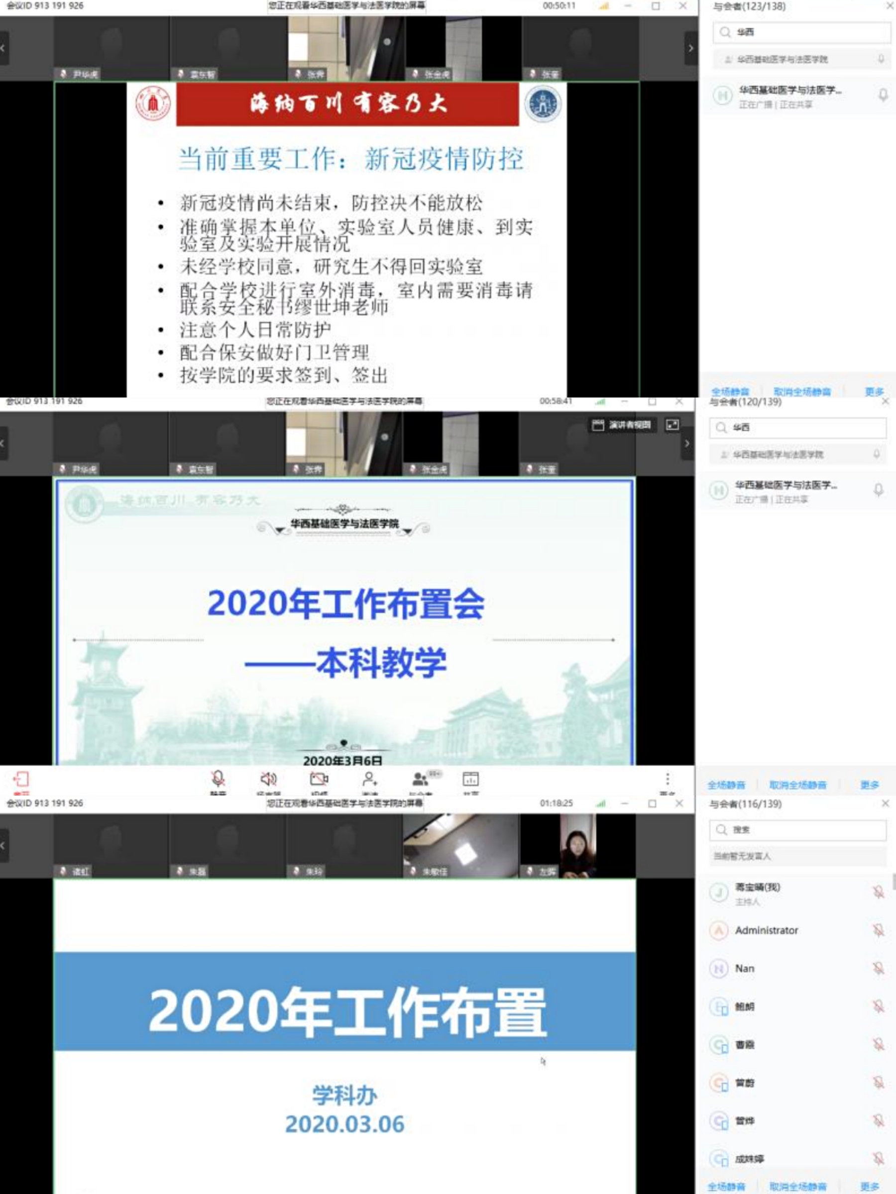 公司党委副书记郭晓伟分别就疫情防控期间员工工作的开展情况、员工深造率、公司宣传等7项工作,副经理方志就安全环保工作、法医楼改造工程等、副经理梁伟波就2020年本科教学重点任务、2020年春季学期前两周本科教学情况、特殊时期线上教学安排等,教授委员会主席刘肖珩就团队建设工作、全国第五轮学科评估、双一流建设中期验收评估等,工会主席黄莉就2020年工会重点工作等提出了新学期的工作安排及相关要求。