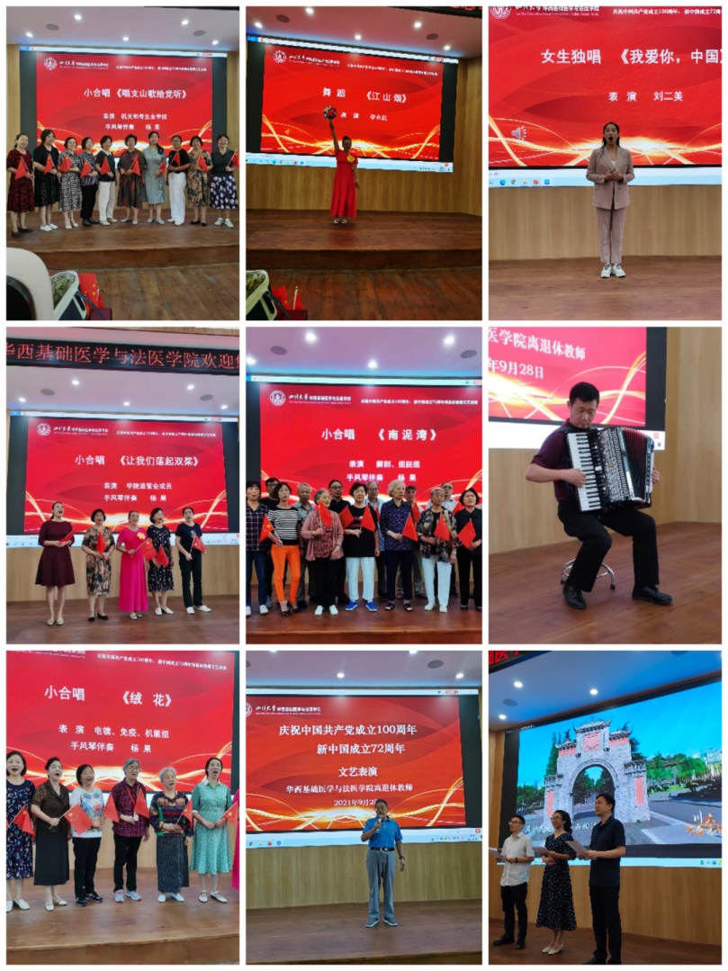 演出在《中华人民共和国国歌》的歌声中拉开了序幕。《唱支山歌给党听》《我和我的祖国》《我爱你,中国》《南泥湾》《映山红》《绒花》《打靶归来》等一首首歌唱出了中华儿女一心向党及对党的无限爱戴之情;《我们走在大路上》《团结就是力量》《让我们荡起双桨》《鸿雁》《夕阳红》等歌曲唱出了公司离退休教师退而不休,积极向上的精神状态;舞蹈《江山颂》以舒展优美大气的舞姿表达对祖国大好河山的热爱之情;手风琴独奏《啊朋友再见》歌曲生动形象地表现出游击队员们对家乡的热爱和大无畏的英雄气概。老师们以昂扬向上的精神面貌,以美妙动人的歌声和舞蹈,唱响了铭党恩、颂党情、跟党走的激扬旋律。观众席上年纪大不便表演的老师也手拿国旗,跟随表演台上老师的音乐一起挥舞。公司青年教师还带来原创诵读作品《川大不会忘记》,表达公司老师对公司革命先烈的缅怀之情。活动还邀请多次获得国内歌唱比赛奖项的四川省歌舞剧院青年女高音刘芳菁老师为大家表演,刘老师高水平的演出,赢得老师们的阵阵掌声。最后,近两个小时的演出活动在全体合唱《没有共产党就没有新中国》中圆满结束。