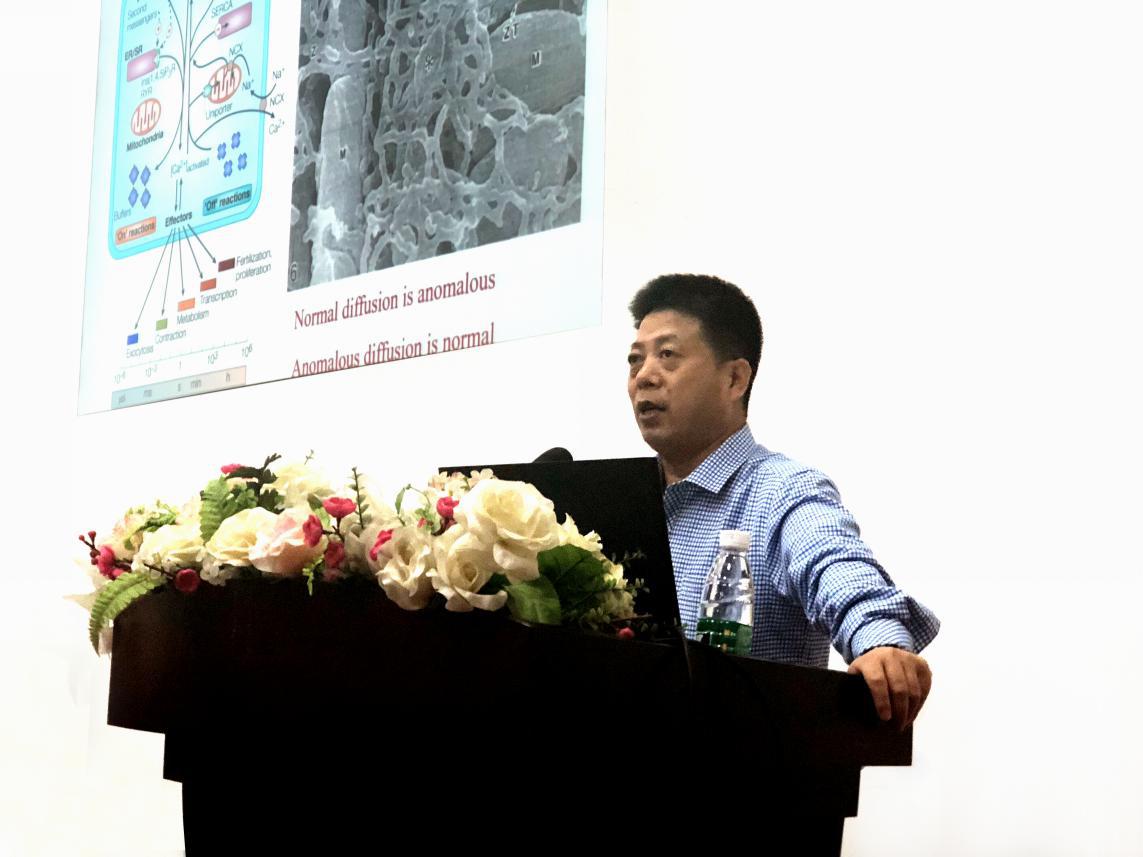 谭教授研究团队从生物力学的角度,深入研究了钙火花的扩散机制和影响钙火花的力学因素。在报告中,谭教授介绍到,心衰常伴随钙离子浓度增高,钙火花是钙致钙释放的基本单位,但以往构建的钙火花“Fick扩散”动力学模型与实验结果相悖,考虑到钙火花在细胞中扩散时的复杂环境,其团队构建了一种空间反常扩散模型,提出了钙离子在细胞内的扩散遵循空间反常扩散机制。谭教授团队对钙波和钙超载现象进行了深入的研究,构建了钙火花和钙夸克的统一力学模型,确定了游离雷诺丁受体对钙波、钙火花的影响,提出了“钙火花-扩散-钙夸克-钙火花”的新型钙波传播模式,明确了钙火花传播和终结的力学机制,这将有助于为探索心衰的防治途径提供力员工物学理论基础。
