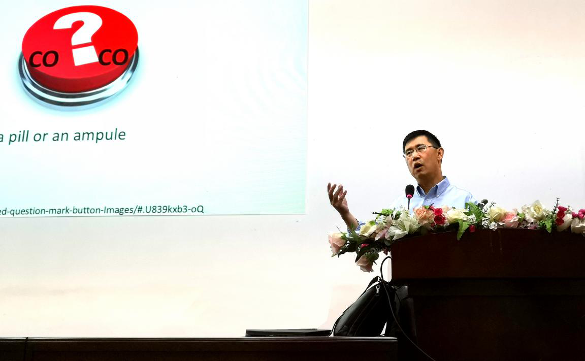 王教授首先向在座的师生抛出了一个问题——“CO能够被开发成为治疗试剂吗”,并以此入手介绍了他们课题组现阶段正在进行将CO开发成为治疗试剂的研究。王教授详细介绍了CO的物理学特性和生物学功能,列举了大量基础研究论证了CO治疗结肠炎等炎性疾病的分子机制,这主要与CO的产生导致谷胱甘肽合成增加和NF-kB信号抑制有关。随后,王教授提出了将CO制成治疗试剂的两大问题——毒性问题与递送问题,王教授解释道,若想将CO制成前药,需要断裂C-C键,这就目前的水平来说技术难度较大。最后,在列举了课题组目前在CO递送方面取得的一系列成果后,王教授肯定了CO作为治疗试剂的可能。