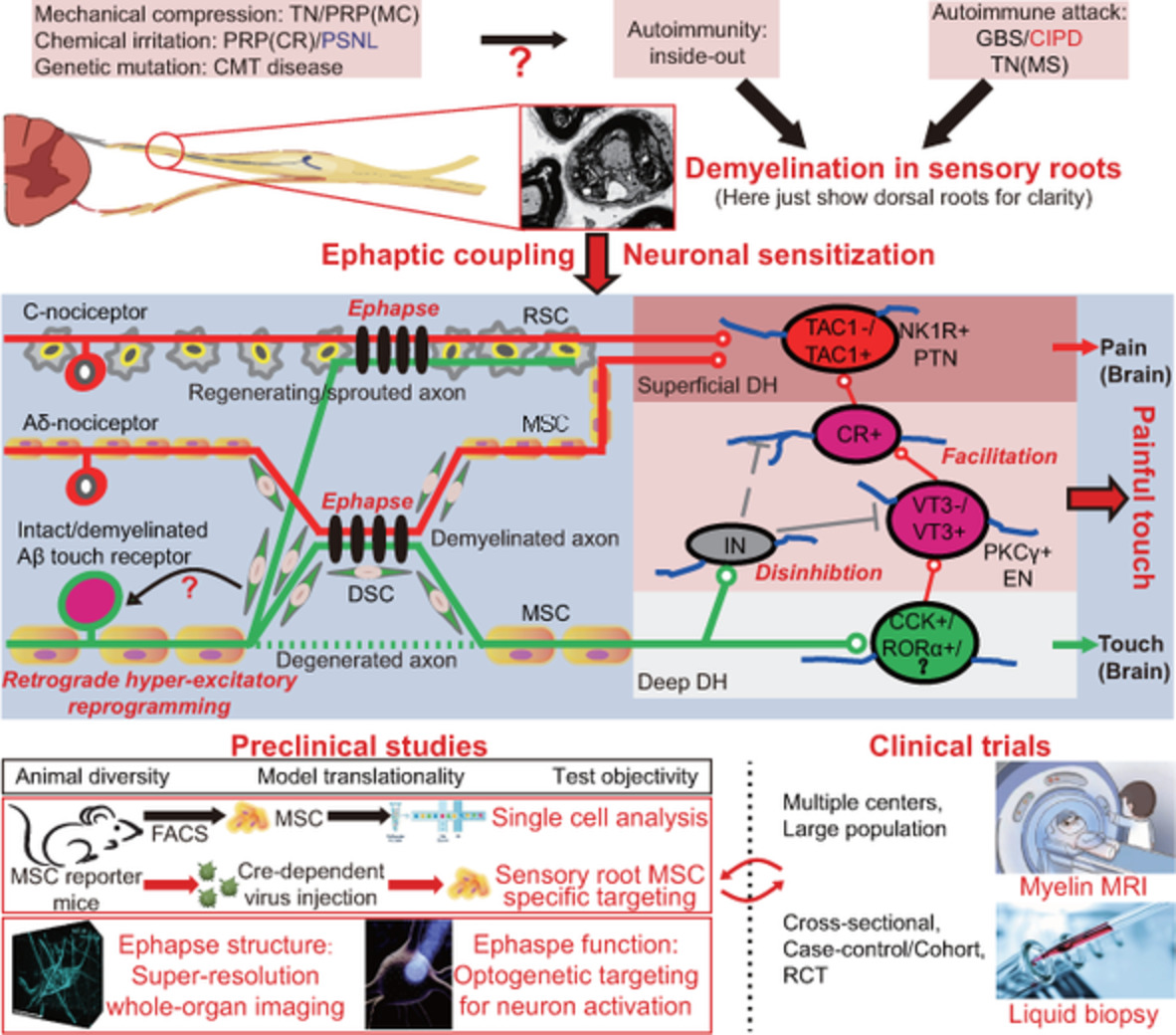 在最新的这篇观点性综述论文中,该团队通过总结和重塑当前零散的临床患者和动物模型证据,注意到一个普遍而又尚未被人重视的的现象,即绝大多数神经病理性触痛发生时均出现感觉神经根的脱髓鞘。在此基础上,他们进一步总结感觉神经根脱髓鞘在神经病理性触痛发生中的充分性和必要性的证据,最后提出感觉神经根脱髓鞘通过旁触偶联和初级感觉神经元过度兴奋性再编程导致触觉改变为痛觉。该论文还讨论了最新的生物技术在研究感觉神经根脱髓鞘致触痛发生中的潜在应用。