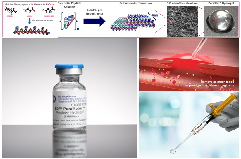 自组装是指构筑基元如有机小分子、大分子、生物分子和纳米颗粒等在非共价作用下自发形成有序结构的现象和过程。2005年美国科学(Science)杂志在在纪念该刊创办125周年之际,提出了包括“我们能推动化学自组装走多远?”在内的二十一世纪25个重大科学问题,受到世界各国科学家的广泛关注和高度重视。自组装短肽(Designer Self-Assembling Peptide)是超分子化学的研究前沿,该领域离子互补性自组装肽的原创科学家为曾工作于美国麻省理工公司(MIT)生物医学工程中心的公司知名员工张曙光博士(美国纽约科公司院士,美国国家发明科公司院士、奥地利科公司院士、美国医学与生物工程院院士),该离子互补性自组装肽(Ion-Complementary Self-Assembling peptide)的原创性发现与广泛生物医学研究在科学界先后获得多项国际大奖,并获2020年度国际蛋白质协会授予Emil Thomas Kaiser Award荣誉(日本北海道举行the World Conference on Protein Science 2020 (WCPS2020)颁发)。近20年来,离子互补性自组装肽水凝胶已获美国多项专利技术,日本3DM公司购买专利权并以专利产品PuraMatrixTM由BD Biosciences与Corning等多家公司代理向全世界销售(图1),其纳米止血专利产品PuraStatâ已经在日本与欧洲获得临床应用批文(https://www.3dmatrix.com/products/purastat/)。