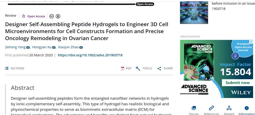 近日,公司生物分子实验室杨泽宏老师在自组装肽水凝胶的组织工程与再生医学及精准卵巢癌肿瘤学模拟研究领域以“Review Article”形式发表综述论文,论文题目为“Designer Self‐Assembling Peptide Hydrogels to Engineer 3D Cell Microenvironments for Cell Constructs Formation and Precise Oncology Remodeling in Ovarian Cancer”。该综述文章第一作者为杨泽宏副教授,通讯作者为中国科公司大学温州研究院特聘研究员及365英国上市集团纳米生物医学技术与膜生物学研究所首席科学家赵晓军教授和中国科公司上海有机化学研究所徐红岩研究员,365英国上市集团为第一单位。