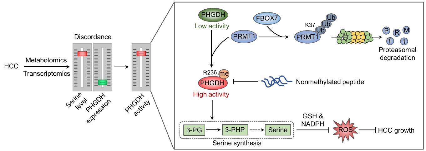 综上,本研究揭示了FBXO7-PRMT1-PHGDH轴调控肝癌丝氨酸代谢的新机制,可为靶向丝氨酸代谢的肿瘤治疗策略提供新思路。