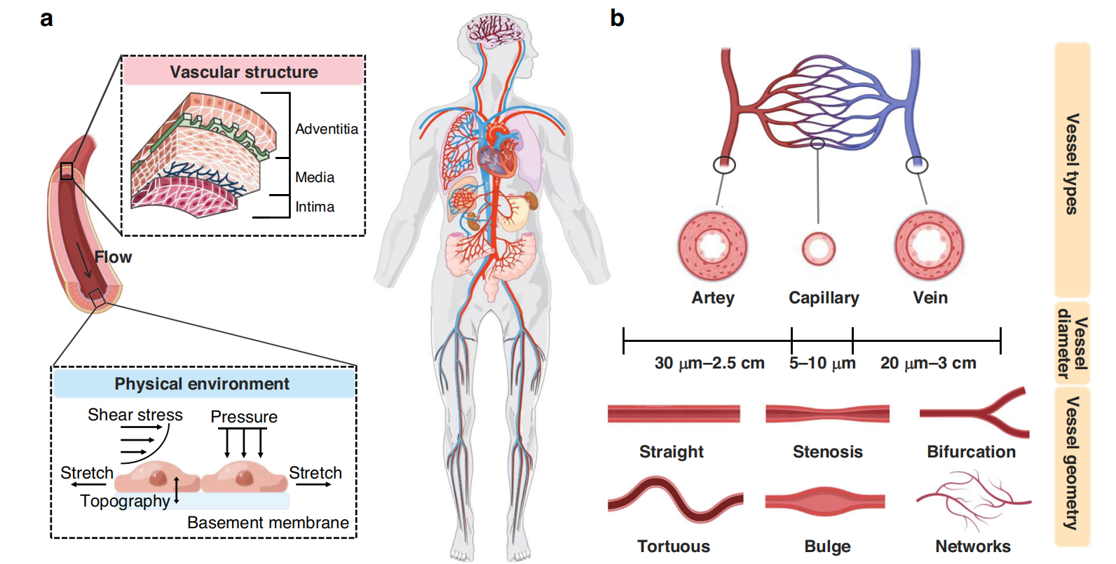 论文系统梳理了体外血管微系统的最新工程化方案,从血管三维结构设计(如分层内膜-中膜-外膜仿生架构)到微制造技术(立体光刻、牺牲模板法等),再到生物材料优选(PDMS、仿生水凝胶)及器官特异性细胞来源(原代内皮细胞、iPSC衍生细胞),形成全链条技术指南(图2)。