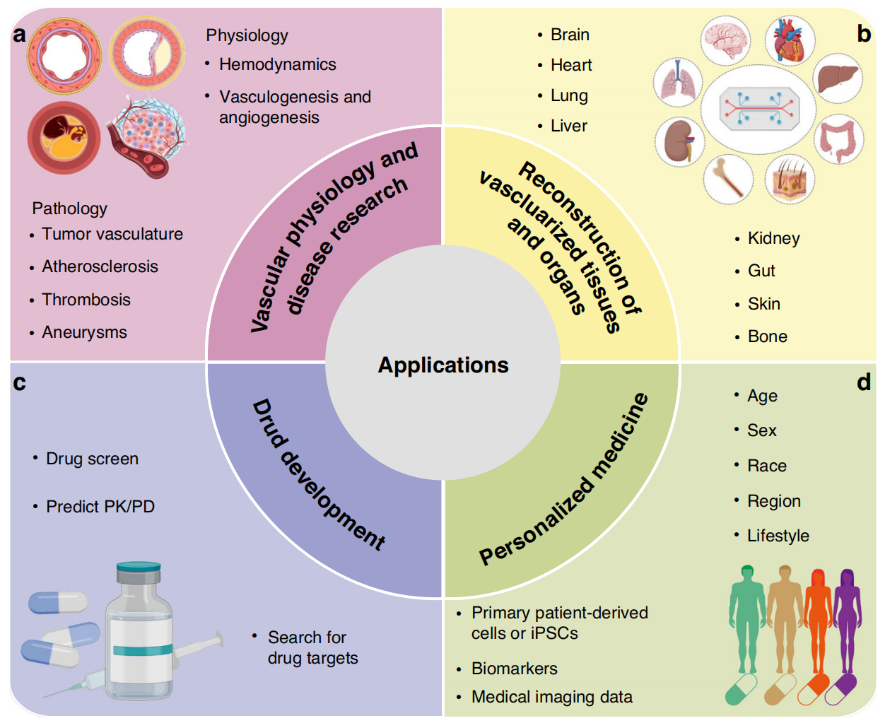 a研究疾病中的血管生理和病理机制;b为再生医学重建血管化组织和器官;c在药物筛选和开发流程中的应用;d通过患者特异性建模在个性化医疗方面的进展。