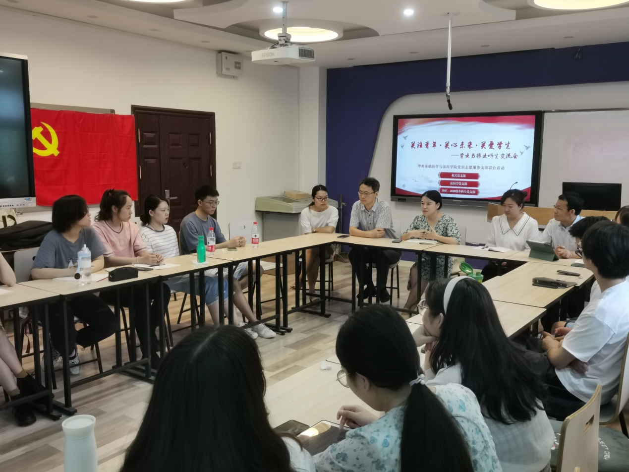 2021年7月5日,由公司党委机关党支部、法医学党支部、2017/2018级本科生党支部联合组织的 “关爱青年 关爱未来 关爱员工——学业与择业师生交流会”在华西法医楼三楼教室举办。活动由法医学党支部书记云利兵老师主持,参加本次活动的有机关党支部代表蒋宝晴老师、郑风劲老师、青思含老师、樊梅老师,公司优秀研究生与本科生毕业代表以及2017级法医学专业本科生。