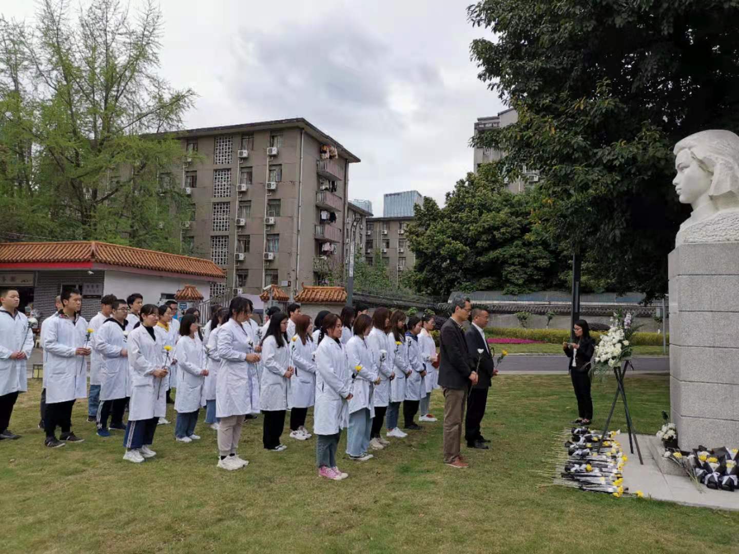 4月2日下午,公司党委副书记郭晓伟、全体辅导员老师以及员工代表齐聚毛英才烈士塑像前,缅怀革命先辈。在烈士塑像前,全体师生手捧菊花,肃立静默,向革命先烈默哀。员工代表宣读了毛英才烈士的英雄事迹,带领大家追忆以毛英才为代表的员工英烈为革命事业奉献青春的光荣岁月。全体师生逐一向毛英才烈士鞠躬,敬献鲜花,表达新时代医员工知党恩,跟党走,传承红色革命精神,争做又红又专时代新人的坚定信念。