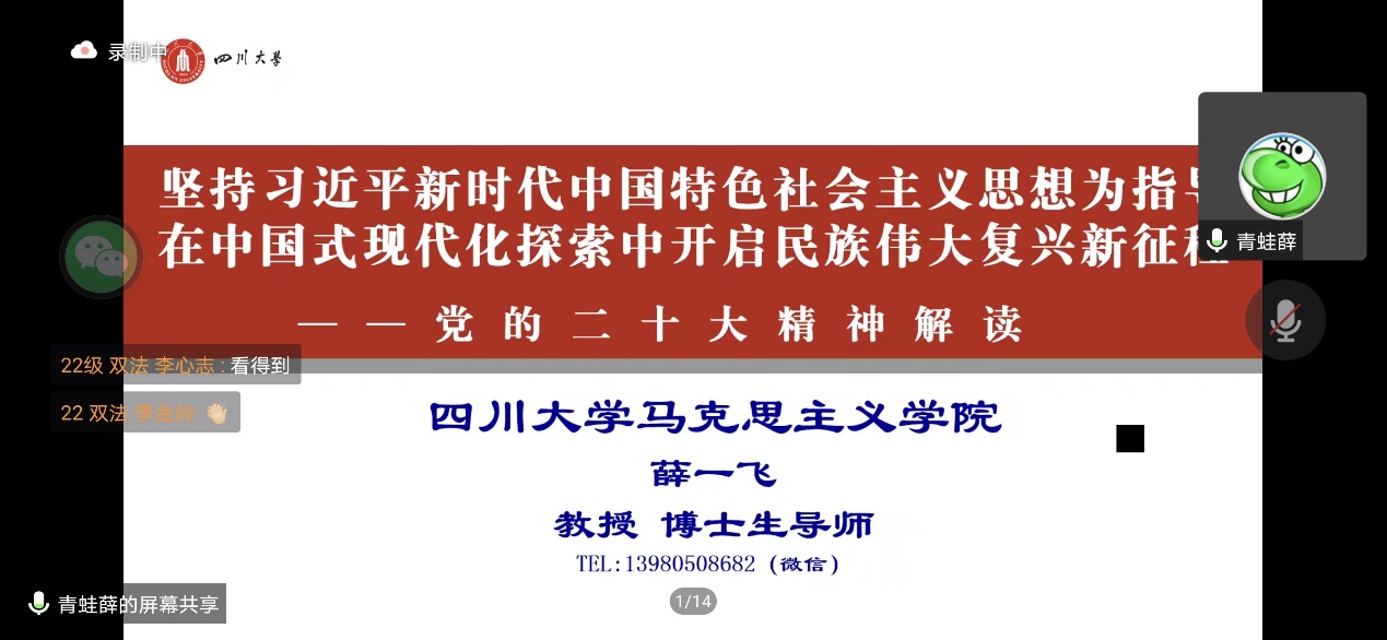 在同学的殷切期盼下,党的二十大报告专题讲座暨本期团校第一次授课正式开始。薛一飞教授以“坚持习近平新时代中国特色社会主义思想为指导,在中国式现代化探索中开启民族伟大复兴新征程”为题,为大家详细解读了党的二十大精神。他从中国共产党的中心任务出发,围绕“四个意识 ”“四个自信”等内涵,深入阐述了新时代十年来的伟大变革等内容。薛教授言语生动,援引实例,为同学们描绘了中国共产党带领全国各族人民波澜壮阔的奋斗之路,启发同学们发扬斗争精神,不畏困难挑战,艰苦奋斗,努力学习,奋勇前进。