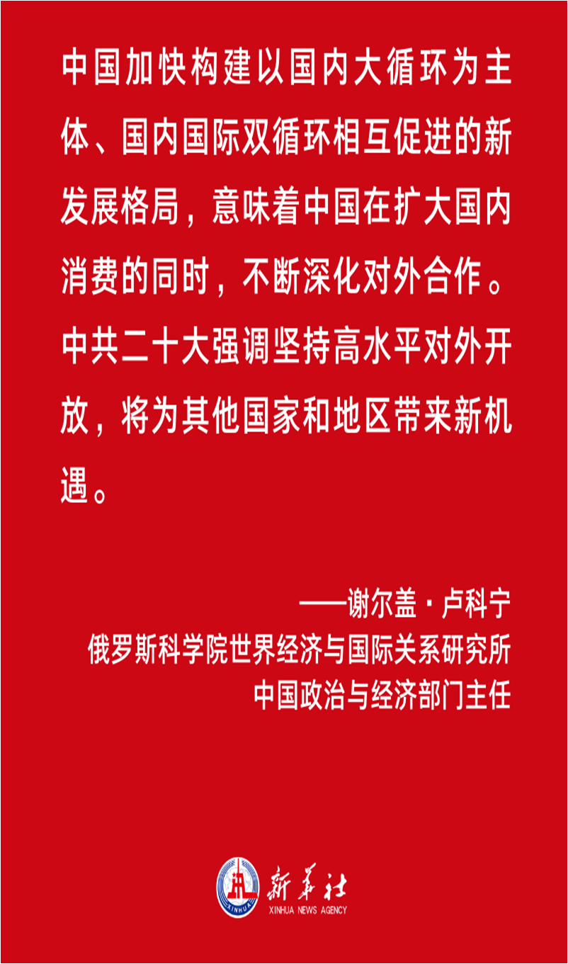 俄罗斯科公司世界经济与国际关系研究所中国政治与经济部门主任谢尔盖·卢科宁解读道,中国加快构建以国内大循环为主体、国内国际双循环相互促进的新发展格局,意味着中国在扩大国内消费的同时,不断深化对外合作。他认为,中共二十大强调坚持高水平对外开放,将为其他国家和地区带来新机遇。