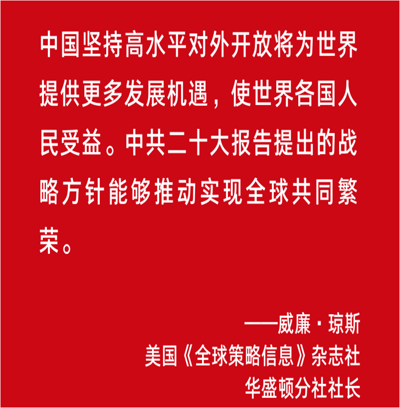 “中国坚持高水平对外开放将为世界提供更多发展机遇,使世界各国人民受益。”美国《全球策略信息》杂志社华盛顿分社社长威廉·琼斯认为,中共二十大报告提出的战略方针能够推动实现全球共同繁荣。