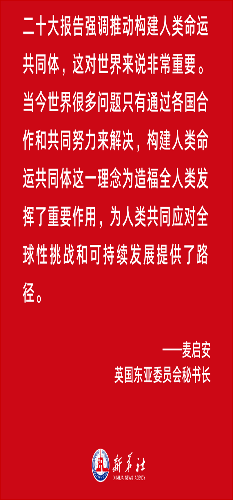 英国东亚委员会秘书长麦启安注意到,二十大报告强调推动构建人类命运共同体,“这对世界来说非常重要”。他指出,当今世界很多问题只有通过各国合作和共同努力来解决,构建人类命运共同体这一理念“为造福全人类发挥了重要作用,为人类共同应对全球性挑战和可持续发展提供了路径”。