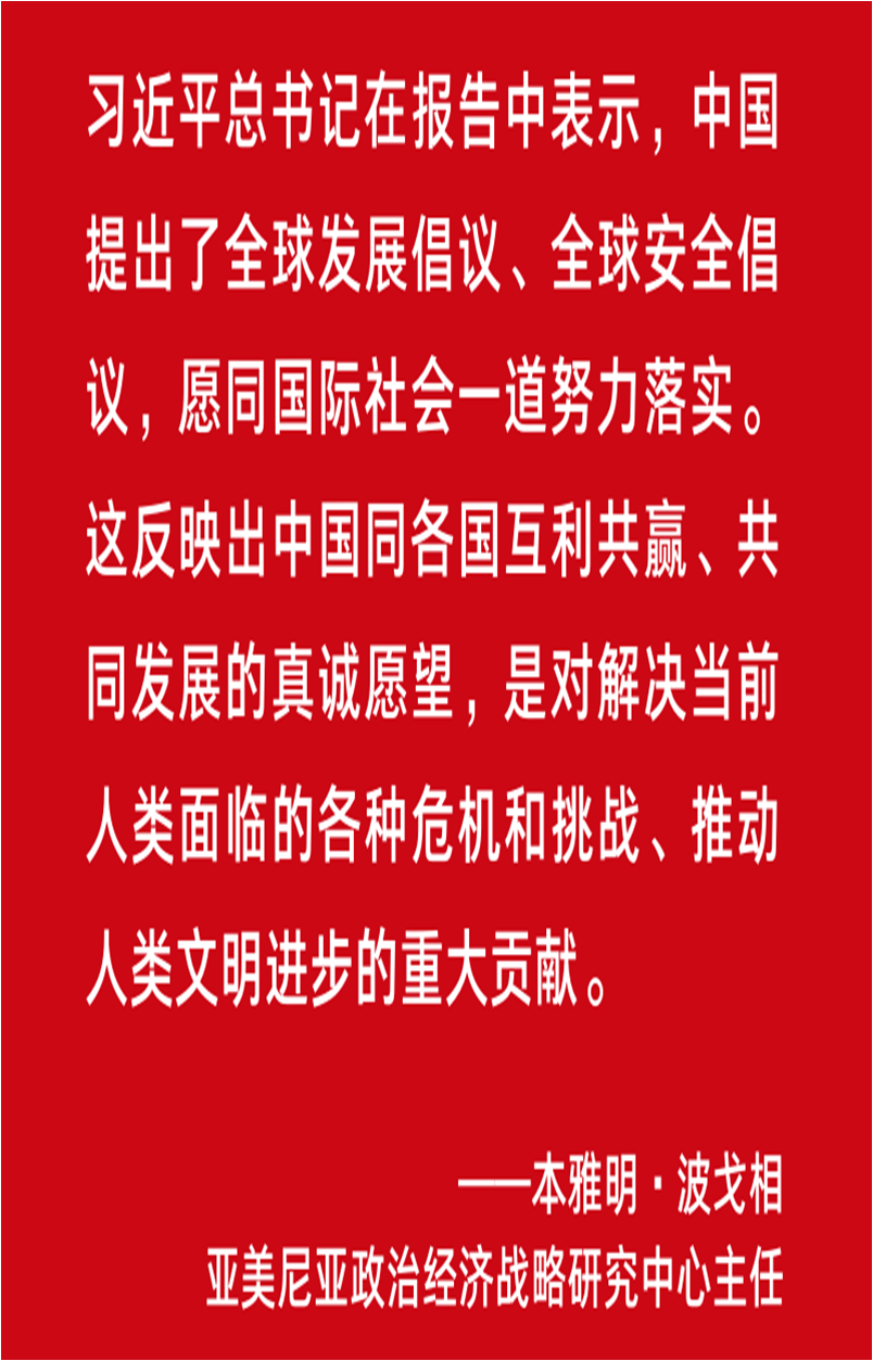 亚美尼亚政治经济战略研究中心主任本雅明·波戈相注意到,习近平总书记在报告中表示,中国提出了全球发展倡议、全球安全倡议,愿同国际社会一道努力落实。“这反映出中国同各国互利共赢、共同发展的真诚愿望,是对解决当前人类面临的各种危机和挑战、推动人类文明进步的重大贡献。”在波戈相看来,中共二十大召开是对世界影响深远的一件大事。