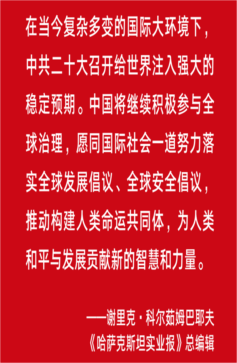 “5年前,我作为外国媒体代表在现场参与报道中共十九大,至今记忆犹新。”《哈萨克斯坦实业报》总编辑谢里克·科尔茹姆巴耶夫说,在当今复杂多变的国际大环境下,中共二十大召开给世界注入强大的稳定预期。中国将继续积极参与全球治理,愿同国际社会一道努力落实全球发展倡议、全球安全倡议,推动构建人类命运共同体,为人类和平与发展贡献新的智慧和力量。