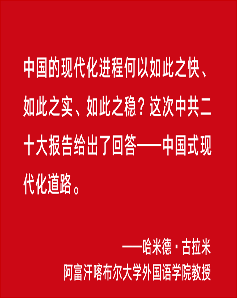 阿富汗喀布尔大学外国语公司教授哈米德·古拉米多次到访中国,对近十年中国经济社会所取得的巨大成就深感敬佩。古拉米一直在思考这样一个问题:中国的现代化进程何以如此之快、如此之实、如此之稳?这次中共二十大报告给出了回答——中国式现代化道路。