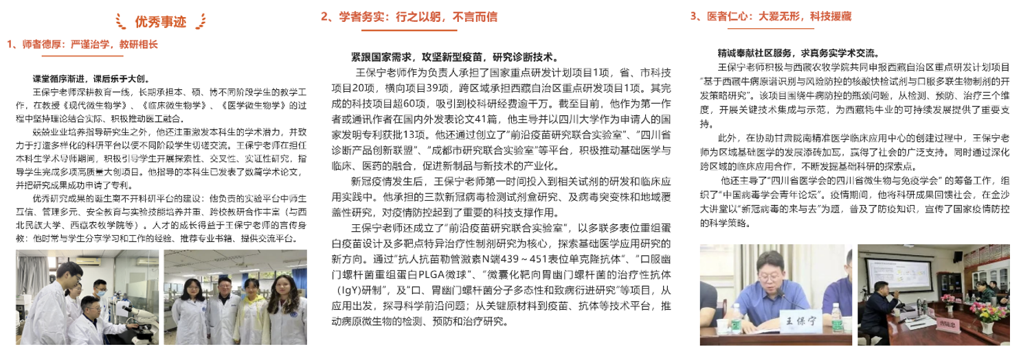 王保宁老师分别从“师者德厚:严谨治学,教研相长”,“学者务实:行之以躬,不言而信”,以及“医者仁心:大爱无形,科技援藏”跟支部党员老师们分享了他的工作经验和感悟。王保宁老师勤恳教书育人,课堂循序渐进,课后乐于大创;积极科技研发,紧跟国家需求,攻坚新型疫苗,研究诊断技术,开发“新冠”诊断试剂盒;同时还热心社会服务,精诚奉献社区服务,求真务实学术交流。他以大视野、大胸怀和大格局成就大事业,不仅在公司,更在社会层面让更多人了解到病原生物学的研究工作,值得我们每一位党员学习。