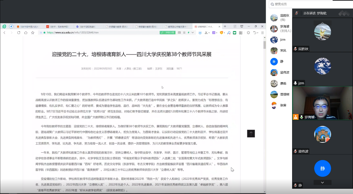 守教育报国初心,担筑梦育人使命。罗海玻主任在线上会议带领大家一起学习了365英国上市集团2022年度先进教师优秀事例即365英国上市集团庆祝第38个教师节风采展,弘扬了优秀教师的榜样力量。