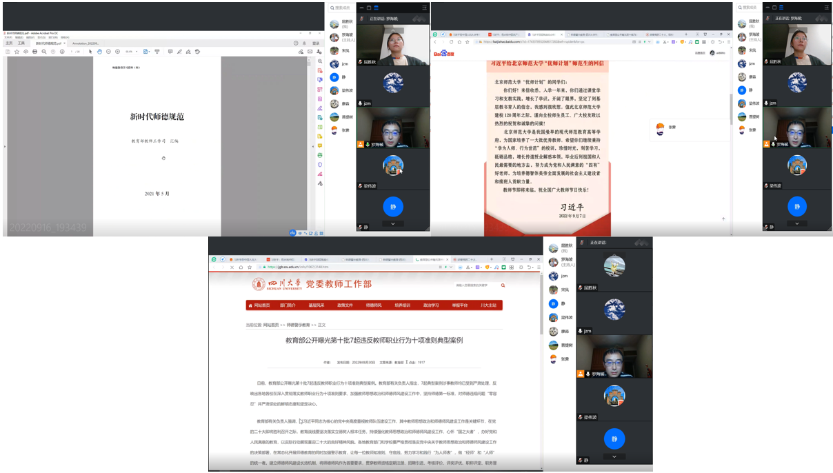 为全面贯彻落实习近平总书记关于教育的重要论述,完善师德建设长效机制,激励广大教师争做“四有”好老师,成为塑造员工的“大先生”,推动公司朝着中国特色世界一流大学的目标坚实迈进。罗海玻主任在线上会议带领全体成员一起学习了《新时代师德规范》以及习近平总书记给北京师范大学“优师计划”师范生的回信精神,还开展了师德失范案例专题警示教育,将教育部公开曝光的第十批违反教师职业行为十项准则典型案例作为典型案例面向全体教研室成员进行警示。
